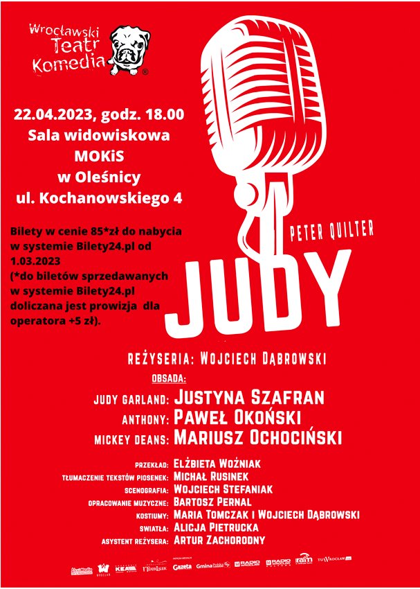 22 kwietnia o godzinie 18 w sali widowiskowej MOKiS odbędzie się spektakl ,,Judy” w wykonaniu aktorów z wrocławskiego Teatru Komedia.