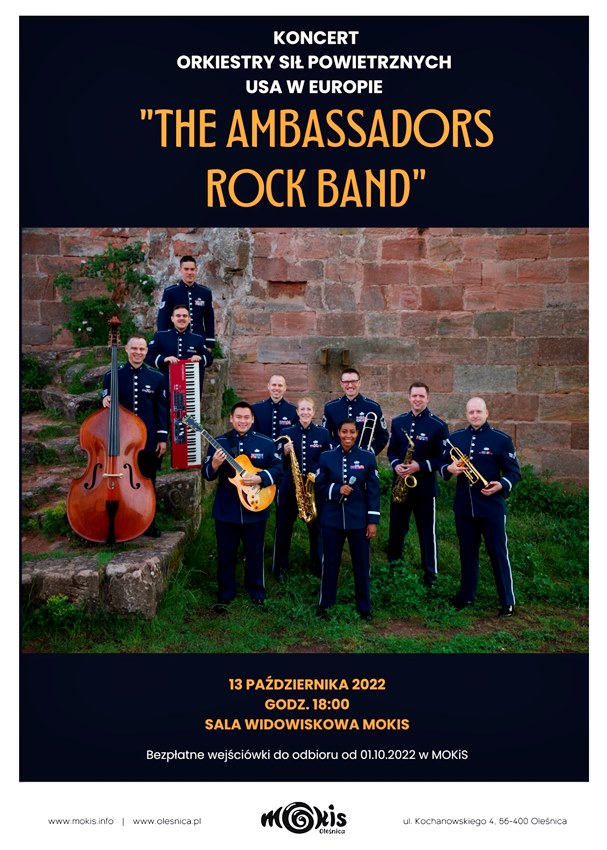The Ambassadors Rock Band, zespół będący częścią orkiestry Sił Powietrznych Stanów Zjednoczonych stacjonujących w Europie -USAFE Band, przyjedzie do Polski z serią koncertów w dniach 11 – 20 października, 2022. 10-osobowy zespół rockowy zagra i zaśpiewa na scenach Brzegu Dolnego, Wrocławia, Oleśnicy, Opola, Katowic, Suchej Beskidzkiej, Bielsku-Białej, Jarosławia, Przemyśla między innymi utwory takie jak Valerie, Rock with You, Levitating. USAFE Band koncertuje na scenach całej Europy, dając blisko 300 koncertów rocznie, budując „muzyczne mosty” i zawsze ciepło zapisując się w sercach publiczności.