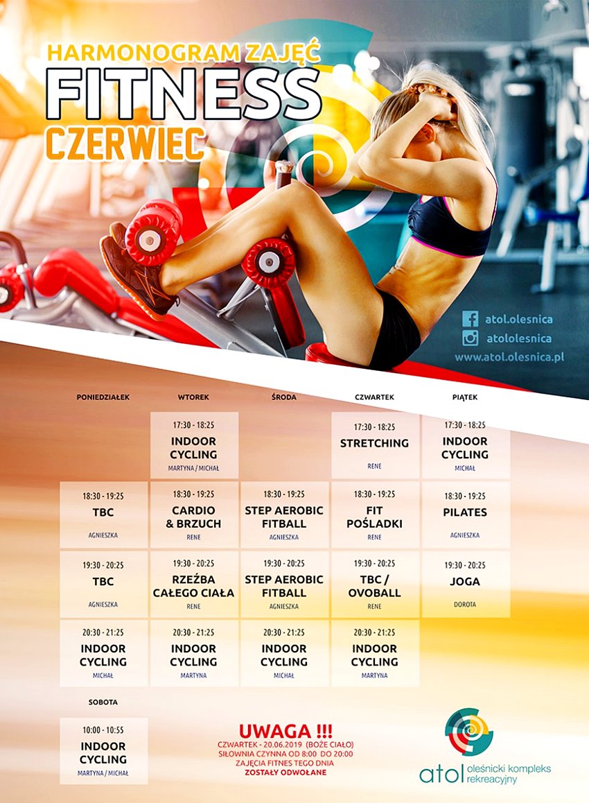 – Nasi instruktorzy zajęć fitness Agnieszka, Martyna, Dorota, Rene i Michał zachęcają do wspólnego działania- podkreśla oleśnicki kompleks, informując, że zajęcia odbywają się sześć razy w tygodniu, od poniedziałku do soboty.
