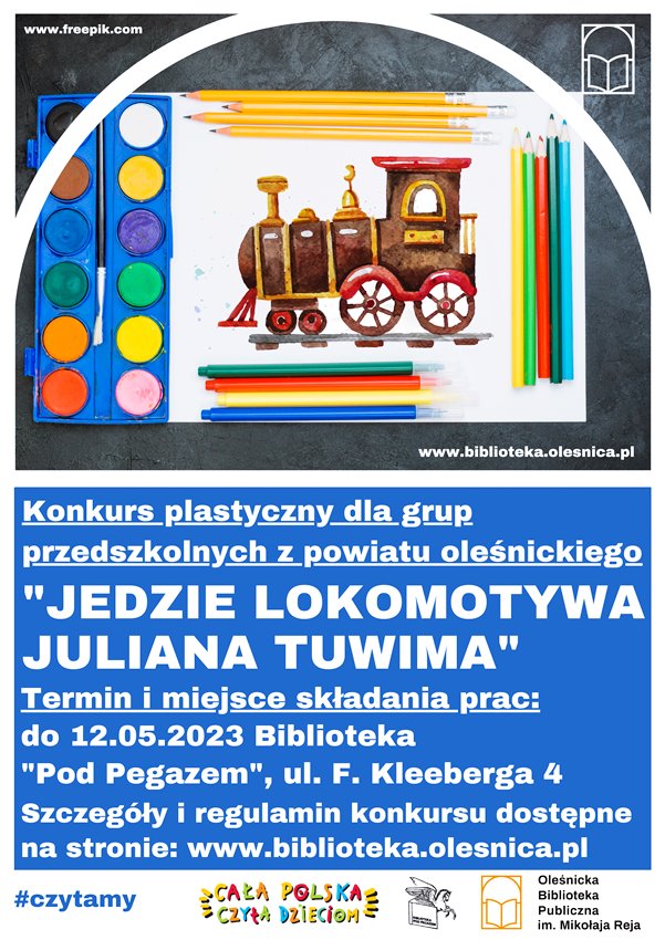 Biblioteka Pod Pegazem zaprasza grupy przedszkolne z powiatu oleśnickiego do udziału w konkursie plastycznym pt. „Jedzie lokomotywa Juliana Tuwima”. Termin i miejsce składania prac to 12 maja w Bibliotece „Pod Pegazem” przy ul. Kleeberga 4.
