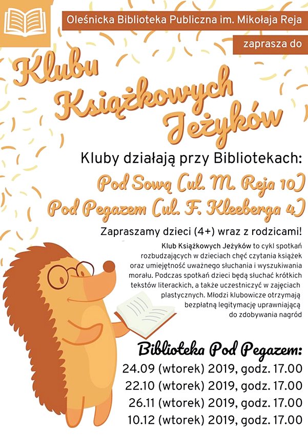 Pierwsze z nich odbędzie się 24 września o godz. 17 w Bibliotece Pod Pegazem, choć klub działa także w Bibliotece Pod Sową. Jest on miejscem rozbudzania u dzieci chęci sięgania po książki.