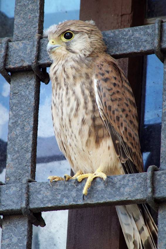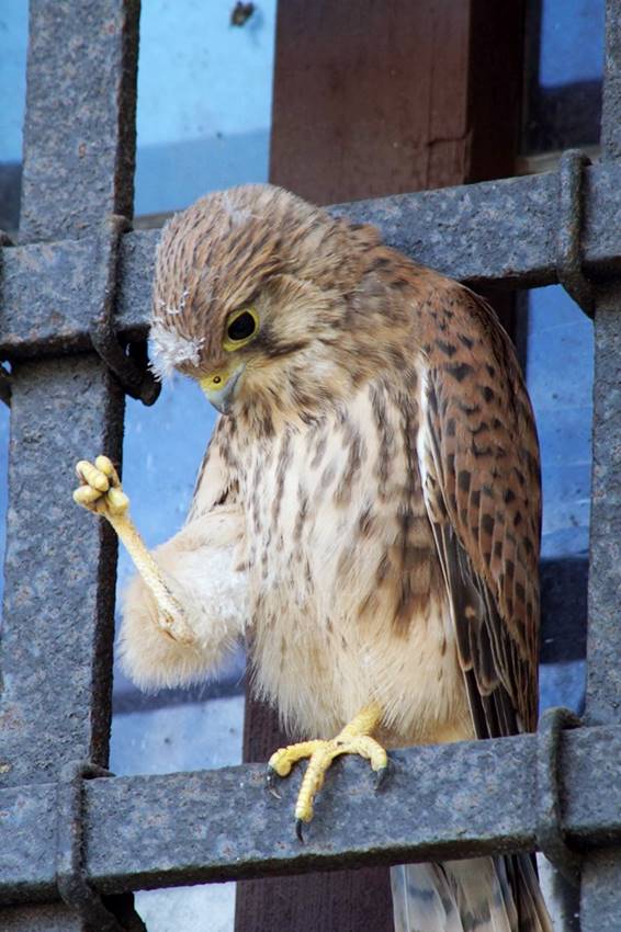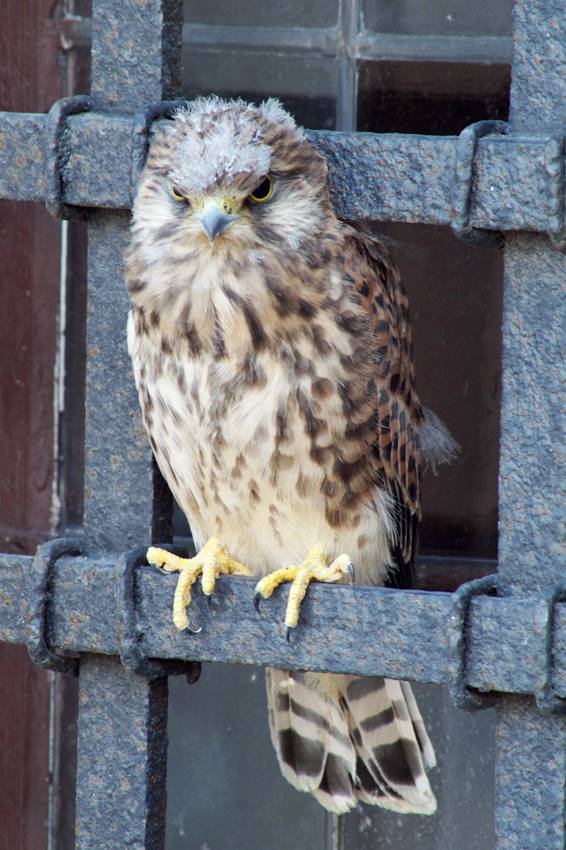 Dwie młode pustułki na kracie okna oleśnickiej bazyliki