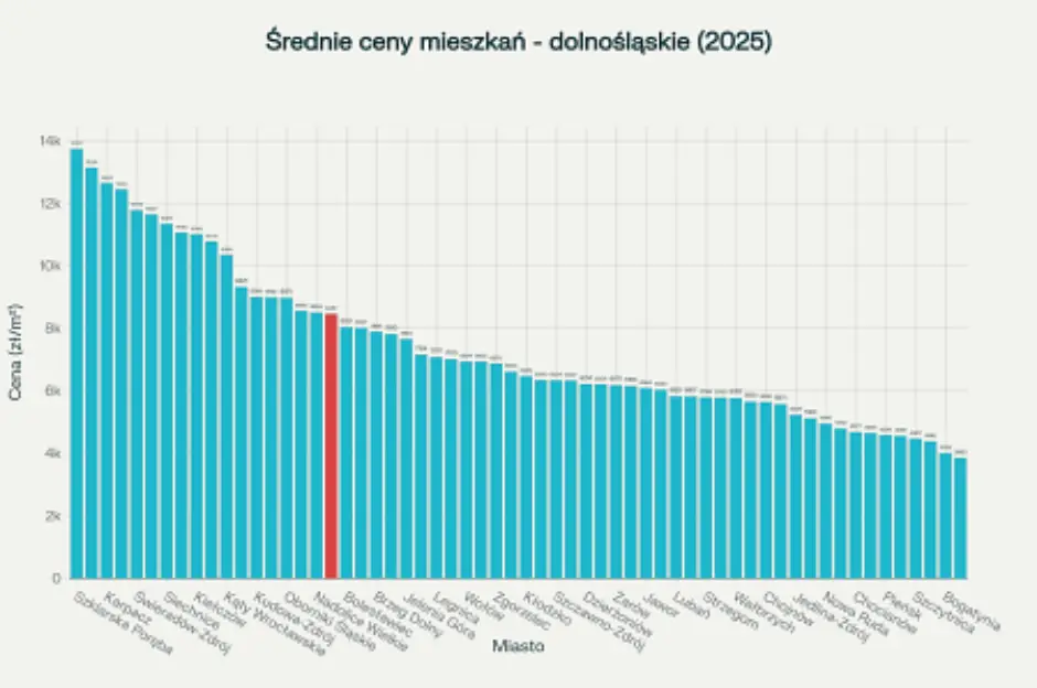 Oleśnica zajmuje siódme miejsce w rankingu najdroższych miast województwa dolnośląskiego pod względem cen mieszkań, z średnią ceną 8 824 zł za metr kwadratowy w 2025 roku. Wrocław zdecydowanie przewodzi z ceną 13 303 zł/m², co czyni Oleśnicę o 34% tańszą od stolicy województwa. Jelenia Góra (8 039 zł/m²) oferuje nieznacznie niższe ceny, podczas gdy Legnica (7 089 zł/m²) i Lubin (7 154 zł/m²) są wyraźnie bardziej przystępne cenowo.