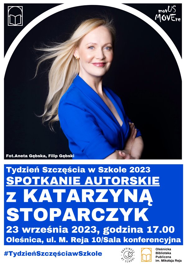 W trakcie Tygodnia Szczęścia w Szkole, 23 września 2023 (sobota) o godzinie 17.00, w Oleśnickiej Bibliotece Publicznej im. Mikołaja Reja odbędzie się spotkanie z Katarzyną Stoparczyk – dziennikarką, autorką książek, reżyserką spektakli teatralnych. Współtwórczyni międzynarodowego projektu „Dajcie nam głos!! Kasia Stoparczyk i dzieci”. Mistrzyni rozmowy. W Polskim Radiu stworzyła kultowe audycje m. in. „Dzieci wiedzą lepiej” i „Myślidziecka 3/5/7”, a we współpracy z Wojciechem Mannem format telewizyjny pt. „Duże Dzieci”.
