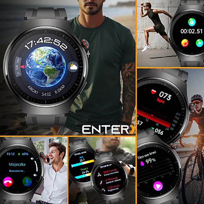 Enter ECT.2.MT.145.34 to idealny wybór dla osób, które cenią solidne wykonanie połączone z przydatnymi funkcjami. Stalowa, czarna koperta jest nie tylko trwała, ale również elegancka, co czyni ten smartwatch odpowiednim zarówno do noszenia na co dzień, jak i podczas bardziej formalnych okazji. Ekran AMOLED oferuje jasny i wyraźny obraz, co zwiększa komfort użytkowania. Model ten wyposażony jest w liczne funkcje zdrowotne, w tym monitor tętna, ciśnieniomierz i pulsoksymetr, co pozwala na stałe monitorowanie kondycji fizycznej. Dodatkowo, funkcje takie jak GPS, powiadomienia o połączeniach i wiadomościach sprawiają, że zegarek jest świetnym wsparciem podczas aktywnego trybu życia.
