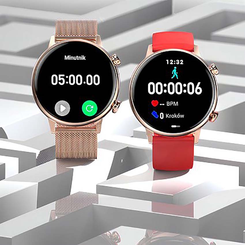 Subtelny i stylowy, Enter SAT.110.535 Lady to smartwatch zaprojektowany z myślą o kobietach ceniących sobie elegancję i funkcjonalność. Koperta w kolorze różowego złota w połączeniu z czerwonym paskiem tworzy nowoczesny i modny wygląd. Zegarek oferuje szeroką gamę funkcji, takich jak monitor snu, ciśnieniomierz, pulsoksymetr oraz powiadomienia o połączeniach i wiadomościach. Dzięki dedykowanej aplikacji FitCloudPro możesz łatwo śledzić swoje postępy i zarządzać funkcjami zegarka.