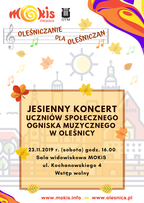Miejski Ośrodek Kultury i Sztuki w Oleśnicy i Społeczne Ognisko Muzyczne w Oleśnicy zapraszają dzisiaj o godzinie 16 do sali widowiskowej na Jesienny koncert uczniów i nauczycieli  Społecznego Ogniska Muzycznego, który odbędzie się w ramach cyklu koncertów „Oleśniczanie dla oleśniczan”.