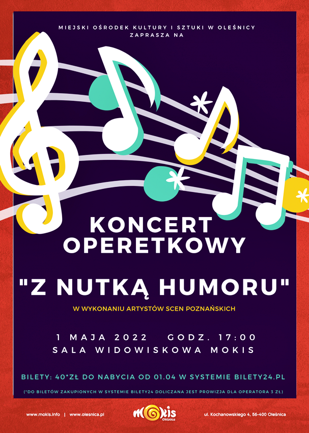 Miejski Ośrodek Kultury i Sztuki w Oleśnicy zaprasza 1 maja o godzinie 17 do sali widowiskowej MOKiS na koncert operetkowy „Z nutką humoru”.