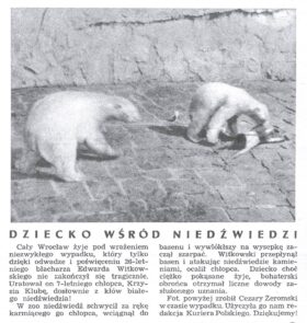 Krzyś wpadł do fosy i momentalnie poszedł na dno. Jeden z niedźwiedzi zanurkował i okaleczonego malca wyciągnął na brzeg. Ciągnięty na środek wybiegu chłopiec krzyczał, by po chwili jedynie płakać. Wśród widzów i świadków był milicjant, który sięgnął po broń i wymierzył w niedźwiedzia. Nie dał jednak rady oddać strzału, bojąc się zranić dziecko lub rozjuszyć któregoś z niedźwiedzi. Przy wybiegu pojawił się Edward Witkowski (mieszkaniec Wrocławia) w tym dniu zwiedzający ZOO. Szedł na Stadion Olimpijski na żużel i przypadkiem znalazł się koło całego wydarzenia. Zaczął rzucać celnie kamieniami i udało mu się odwrócić na tyle uwagę niedźwiedzi, że te puściły rannego chłopca. Z węża ogrodniczego leżącego na pobliskim trawniku, przy pomocy pozostałych uczestników zajścia szybko związał linę po której opuścił się na wybieg. W tym samym czasie milicjant wsparty o ogrodzenie mierzył z pistoletu do zwierząt.