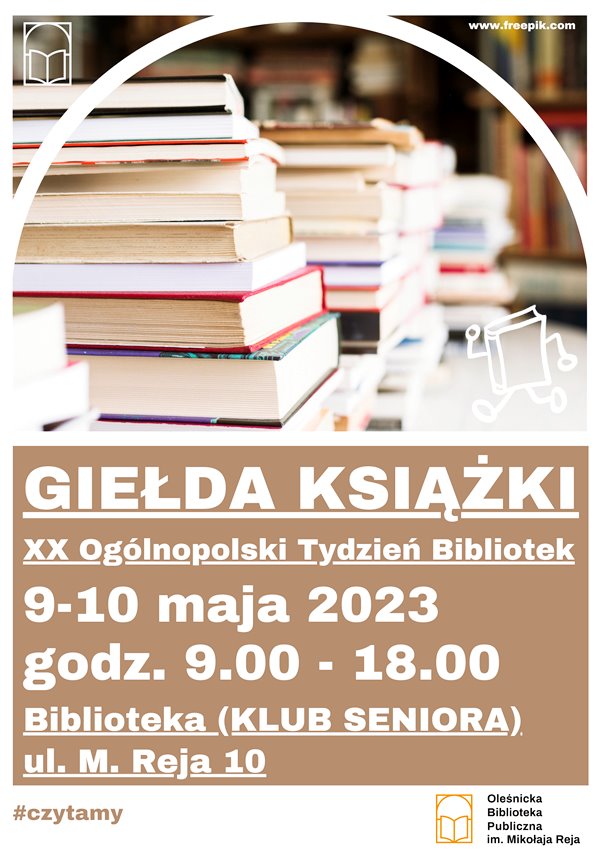 Oleśnicka Biblioteka Publiczna im. M. Reja zaprasza na wiosenną giełdę książki przeczytanej w ramach XX Ogólnopolskiego Tygodnia Bibliotek.