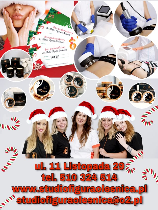 Koncept, który powstał z myślą wyłącznie o komforcie dla kobiet. Poparte doświadczeniem ponad 800 gabinetów staramy się jak najlepiej pomóc każdej kobiecie w zdrowy i zrównoważony sposób uzyskać wymarzoną figurę bez efektu jo jo. Studio Figura Oleśnica to wyjątkowe miejsce dla kobiet, które marzą o relaksie i odpoczynku połączonym z poprawą samopoczucia i wyglądu. Oferujemy specjalistyczne zabiegi wyszczuplające i modelujące sylwetkę: liposukcja, endermologia, lipolaser, multipolar, vaccum RF. Zabiegi na twarz, szyję, dekolt z kosmetologii estetycznej: endermologia, fala multipolarna, hydrabrazja, sonoforeza, infuzja tlenowa, mezoterapia bezigłowa są idealną pieleęgnacją odżywiającą, odmładzającą i ujędrniającą oraz wspierającą w leczenie trądziku, przebarwień i spękanych naczynek. A to wszystko dopełniamy wyjątkowymi, idealnie dobranymi kosmetykami oraz suplementami, które wytwarzane są wyłącznie dla konceptu Studia Figura. Modelowanie sylwetki, pielęgnacja ciała, zdrowy styl życia – to tematy, które nas fascynują!!!!! Dopasowujemy idywidualne plany treningowo- zabiegowe oraz układamy plan żywieniowy, spieramy w dążeniu do osiągnięcia rewelacyjnego efektu końcowego. Z myślą o naszych klientach i ich bliskich proponujemy Vouchery świąteczne na nasze ekskluzywne zabiegi w strefie odpoczynku i relaksu. Z pewnością będą one bardzo miłym upominkiem w tym szczególnym czasie.