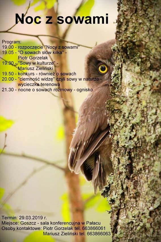 Start 29 marca o godz. 19 w sali konferencyjnej Pałacu w Goszczu. Należy zabrać ze sobą niezbędne wyposażenie, czyli latarki, obuwie i strój terenowy oraz lornetki (jeżeli ktoś posiada). – Miejmy nadzieję, że sowy nam dopiszą – piszą leśnicy.