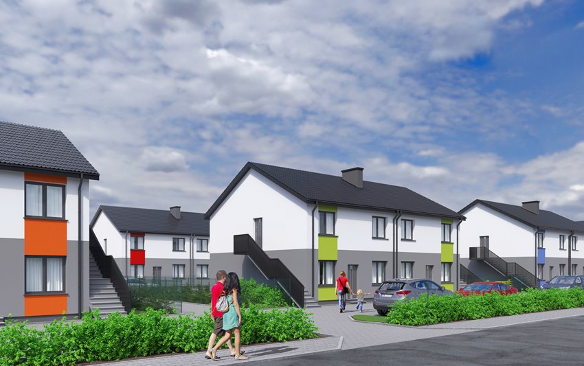Ciekawym elementem zabudowy są również elewacje. Opierają się one na neutralnej, biało-szarej kolorystyce, jednak każdy z budynków został wzbogacony o akcent kolorystyczny. Każdy dom zawiera barwny element w innym kolorze, co ułatwia jego identyfikację.