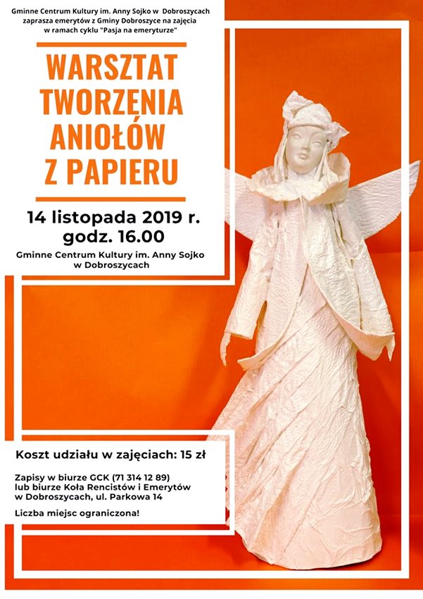 Tym razem będą to warsztaty tworzenia aniołów z papieru. Odbędą się one 14 listopada. Udział w warsztatach jest płatny. Koszt: 15 zł. Zapisy przyjmuje GCK w Dobroszycach lub Koło rencistow i Emerytów w Dobroszycach.