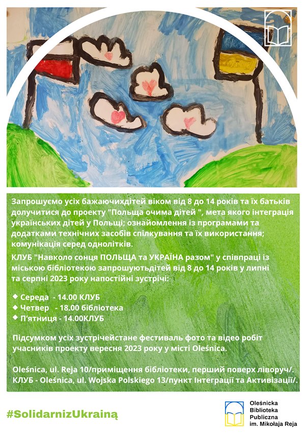 Oleśnicka Biblioteka Publiczna im. Mikołaja Reja wspólnie z Klubem „Wokół słońca POLSKA i UKRAINA razem” zaprasza dzieci w wieku od 8 do 14 lat wraz z rodzicami do udziału w projekcie „Polska oczami dzieci”, którego celem jest integracja ukraińskich dzieci w Polsce; zapoznanie się z programami i aplikacjami środków komunikacji oraz ich wykorzystaniem w komunikacji między rówieśnikami.