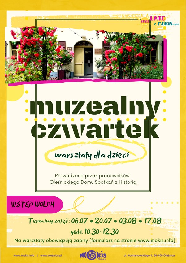 Miejski Ośrodek Kultury i Sztuki w Oleśnicy zaprasza na cykl warsztatów „Muzealny Czwartek” dla dzieci w wieku 7-10 lat. Zajęcia odbędą się w Oleśnickim Domu Spotkań z Historią w czwartek 3 sierpnia o godzinie 10:30. Na zajęcia obowiązują zapisy wyłącznie przez formularz internetowy dostępny na stronie www.mokis.info