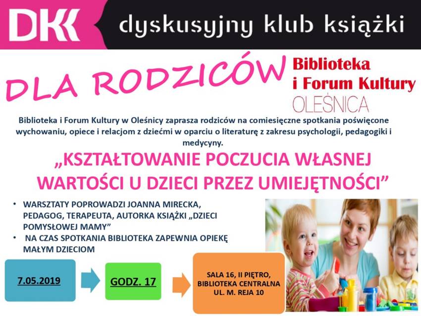 Biblioteka i Forum Kultury zaprasza rodziców na comiesięczne spotkania poświęcone wychowaniu, opiece i relacjom z dziećmi w oparciu o literaturę z zakresu psychologii, pedagogiki i medycyny.