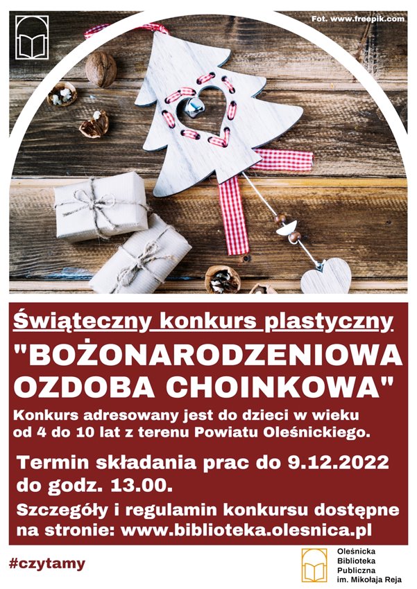 Biblioteka dla Dzieci i Młodzieży „Pod Sową” zaprasza dzieci w wieku od 4 do 10 lat do udziału w świątecznym konkursie plastycznym „Bożonarodzeniowa ozdoba choinkowa”. Termin składania prac upływa 9 grudnia o godzinie 13.