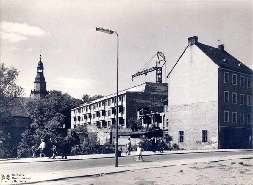 – Tak wyglądało miejsce przy obecnej ulicy 3 Maja zanim wybudowano tam fontanny i pojawił się mural – przypomina Oleśnicki Dom Spotkań z Historią. Autor tego zdjęcia nie jest znany. Pochodzi ono ze zbiorów Oleśnickiej Biblioteki Cyfrowej.