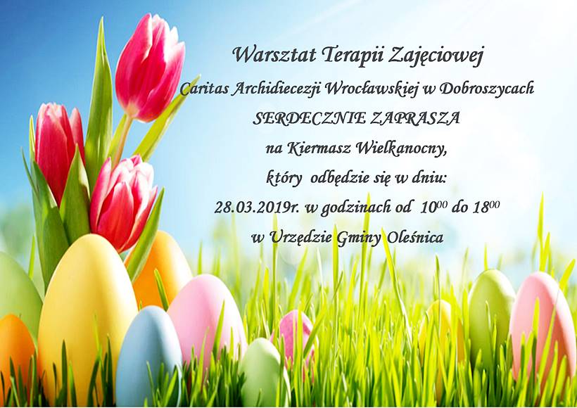 Na kiermasz zapraszają Warsztaty Terapii Zajęciowej Caritas Archidiecezji Wrocławskiej. Odbędzie się on 28 marca w godzinach od 10 do 18 w budynku Urzędu Gminy Oleśnica.