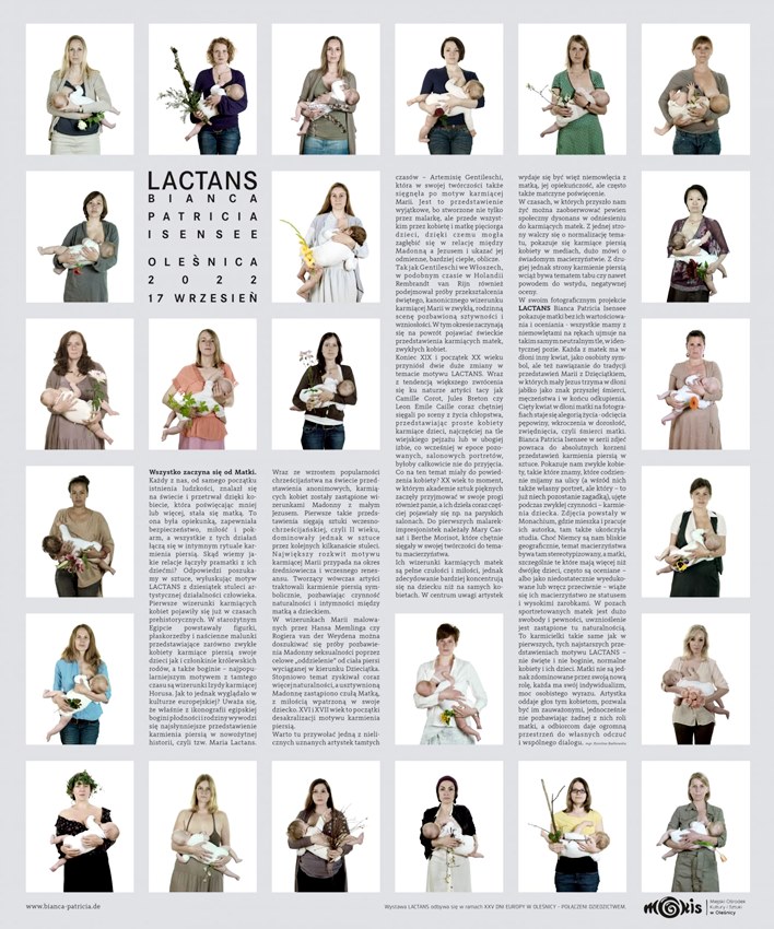 Miejski Ośrodek Kultury i Sztuki w Oleśnicy zaprasza 17 września o godzinie 12 do oleśnickiego Rynku na otwarcie wystawy plenerowej „Lactans” Bianki Patricii Isensee.