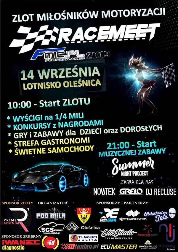 14 września na oleśnickim lotnisku odbędzie się pierwszy Zlot Miłośników Motoryzacji pod nazwą Racemeet 2K19. Pierwsze starty rozpoczną się o godzinie 11:00. O godzinie 21 rozpocznie się Summer Night Projekt.