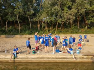 Dzień Pierwszy – mnóstwo wrażeń , dużo sportu i pierwsze kąpiele w jeziorze. Rano rozruch – starsi biegali po lesie podziwiając piękne widoki porannego słońca. Młodsza grupa robiła rozruch na boisku do piłki siatkowej. Później obiad, a po południu plażowanie.