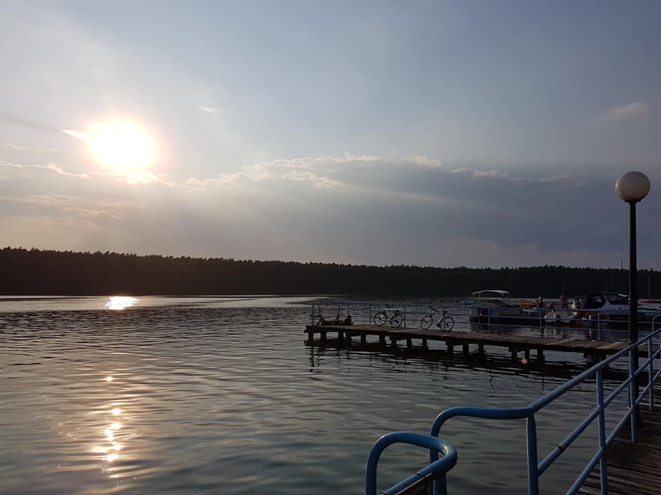 Dzień Pierwszy – mnóstwo wrażeń , dużo sportu i pierwsze kąpiele w jeziorze. Rano rozruch – starsi biegali po lesie podziwiając piękne widoki porannego słońca. Młodsza grupa robiła rozruch na boisku do piłki siatkowej. Później obiad, a po południu plażowanie.