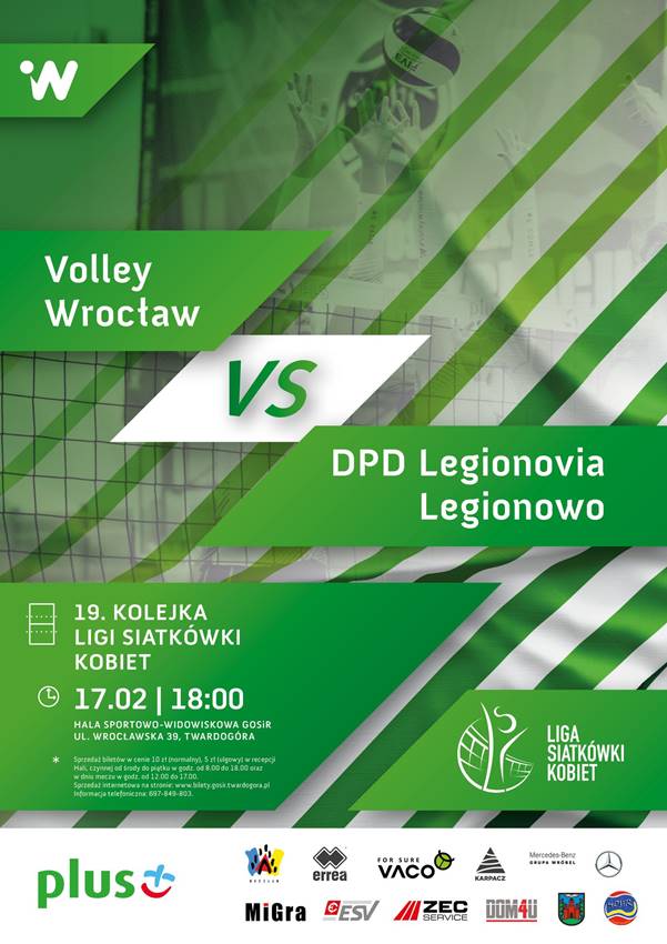 W niedzielę 17 lutego, o godz. 18 w hali sportowej Gminnego Ośrodka Sportu i Rekreacji w Twardogórze odbędzie się mecz 19. kolejki Ligi Siatkówki Kobiet pomiędzy Volley Wrocław a DPD Legionovia Legionowo.