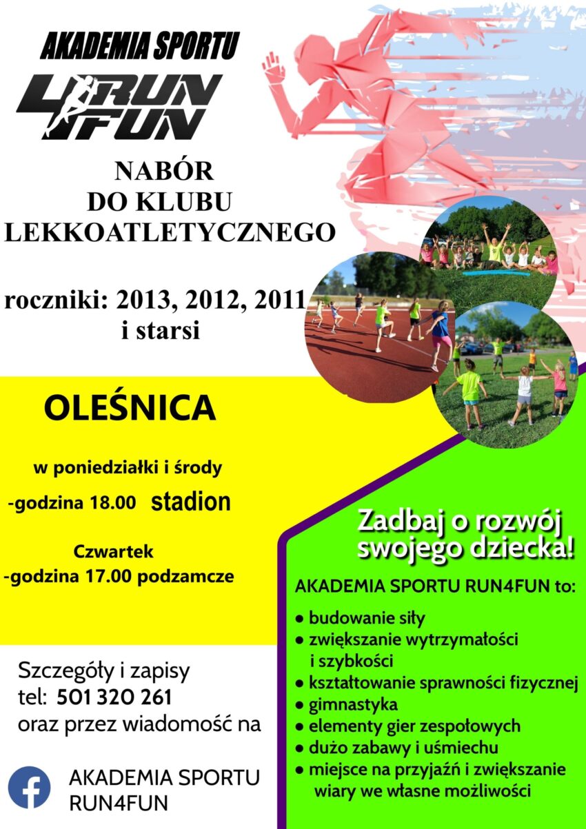 Akademia Sportu Run4Fun zaprasza dzieci i młodzież do spróbowania swoich sił w konkurencjach lekkoatletycznych. – Aktualnie prowadzimy nabór dzieci z roczników: 2013,2012,2011,2010,2009,2008 i starsi – informują działacze. – Trenujemy w poniedziałki i środy o godzinie 18 na stadionie miejskim w Oleśnicy oraz w czwartki o godzinie 17 na podzamczu. Klub posiada licencję PZLA i nasi zawodnicy uczestniczą w rywalizacji sportowej Polskiego Związku Lekkiej Atletyki.