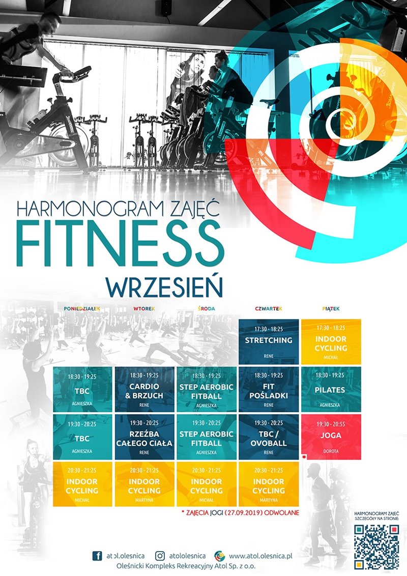 We wrześniu w OKR Atol będzie można skorzystać z szeregu zajęć fitness. Odbywają się one od poniedziałku do piątku, a szczegółowy harmonogram znajduje się na plakacie.