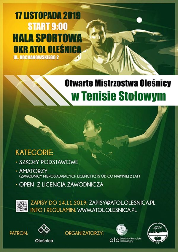 Oleśnicki Kompleks Rekreacyjny Atol i Klub Sportowy Ajde Oleśnica serdecznie zapraszają na Otwarte Mistrzostwa Oleśnicy w Tenisie Stołowym.