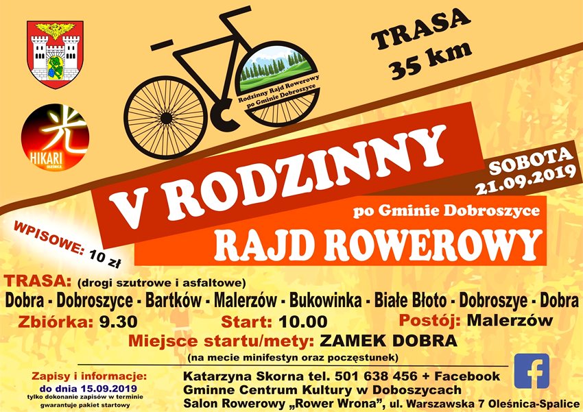 Zapisy trwają do 15 września. Informacje na temat rajdu u organizatorki Katarzyny Skornej (pod numerem telefonu 501 638 456) lub w Gminnym Centrum Kultury w Dobroszycach oraz w salonie rowerowym Wrona na Spalicach. Wpisowe wynosi 10 zł.
