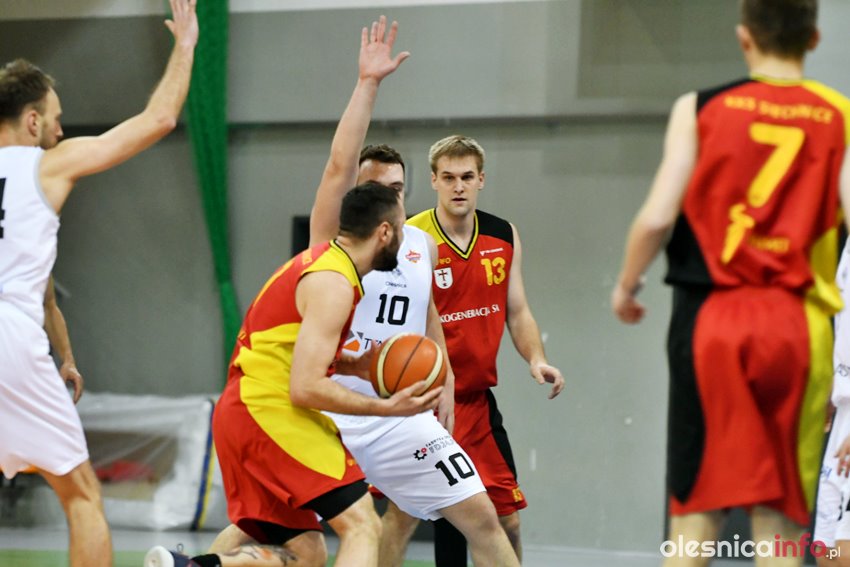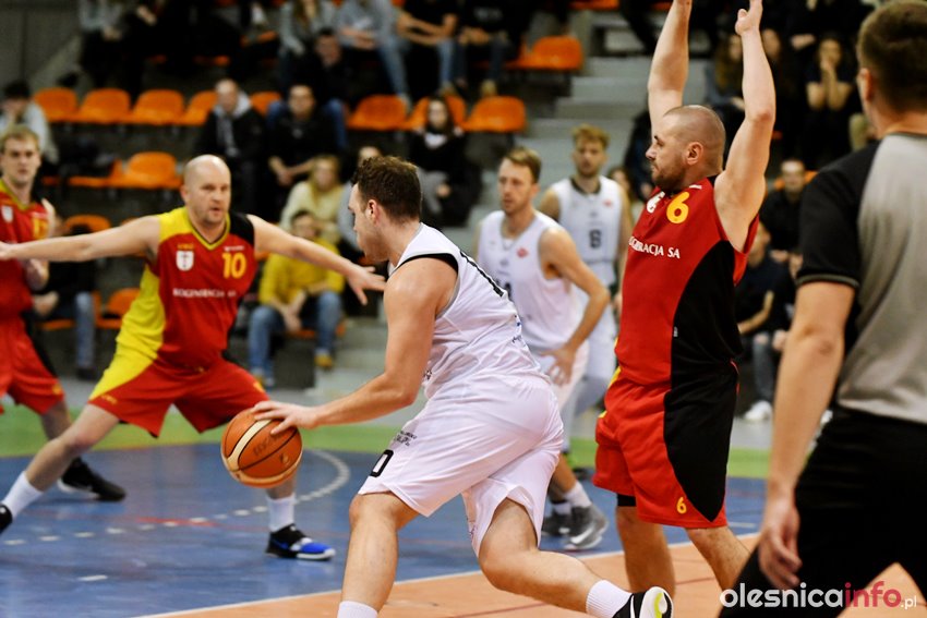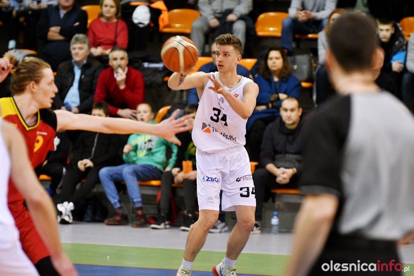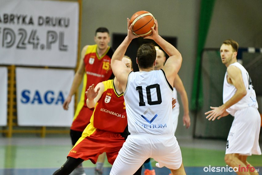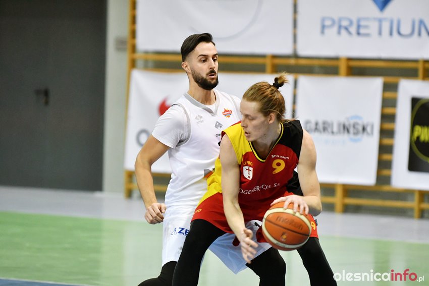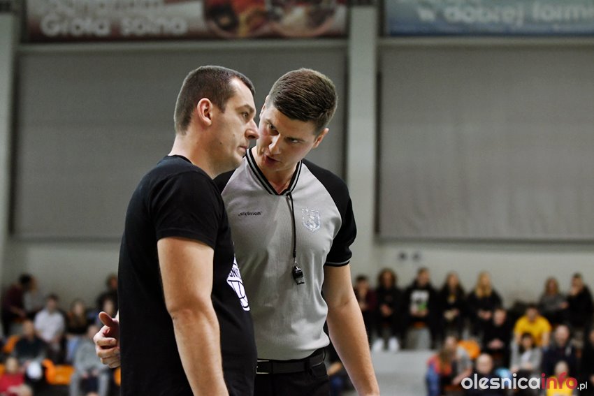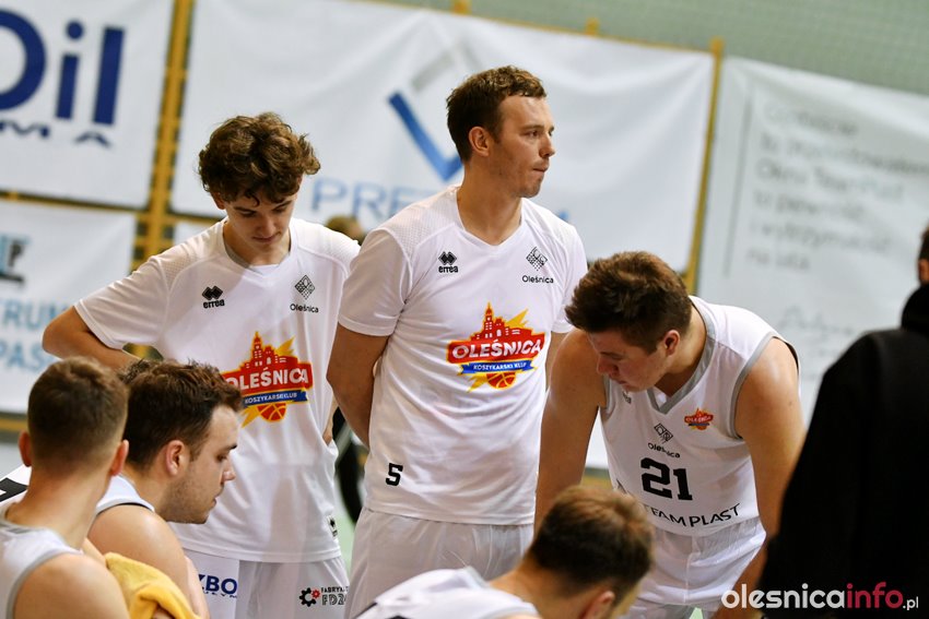 Do przerwy oleśniczanie gonili wynik, bo pierwszą kwartę przegrali wysoko – 14:25. W drugiej gra zespołu Piotra Gliniak mocno się poprawiła i w pewnym momencie przewaga stopniała do zaledwie trzech oczek. Swoją cegiełkę dorzucił do tego Łukasz Horn, który nie mylił się z dystansu. Na przerwę zespół z Oleśnicy schodził jednak ze stratą 8 punktów, przegrywając 38:46.
