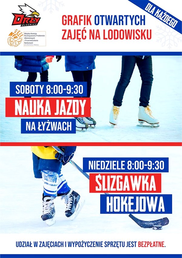 Odbędą się one na lodowisku w godzinach 8.00 – 9.30. Sobota – nauka i doskonalenie jazdy na łyżwach, niedziela – ślizgawka hokejowa, podstawy gry w hokeja i nauka jazdy na łyżwach. Udział i wypożyczenie sprzętu (łyżew i kasków) bezpłatnie. Organizator – Oleśnicki Klub Hokejowy – zapewnia trzech instruktorów.