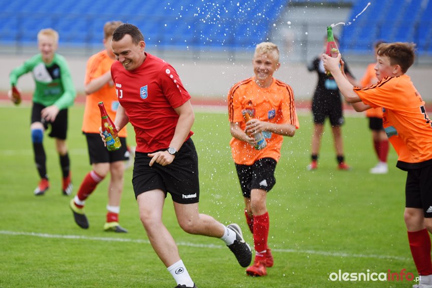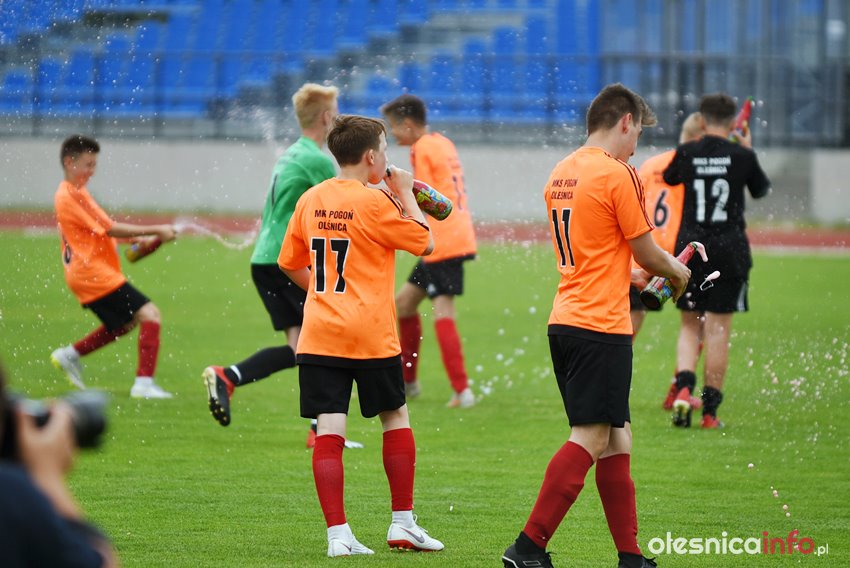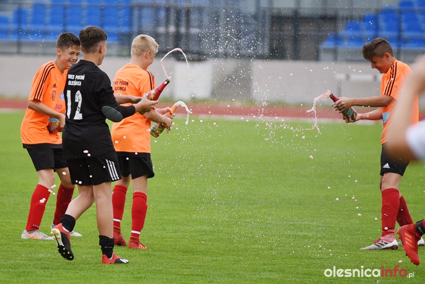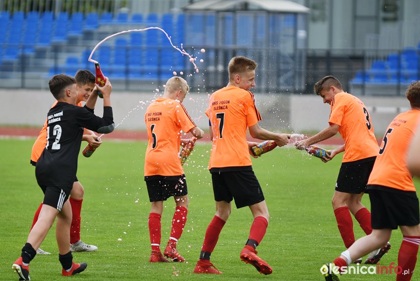 Podopieczni Marcina Jurasika do przerwy prowadzili 4:0. Na listę strzelców wpisywali się Michał Królik, Bartek Śliwiński i dwukrotnie Bartek Maślanka. Po przerwie piątą bramkę dołożył Szymon Nasiadek, a rywale zdołali odpowiedzieć jednym golem. To jedenaste zwycięstwo zespołu Pogoni Oleśnica w tym sezonie. MKS już kilkanaście dni temu zapewnił sobie awans do II ligi okręgowej, ale to dziś przyszedł czas na świętowanie. Wystrzeliły więc szampany, a rodzice przygotowali tort ze zdjęciem zawodników.