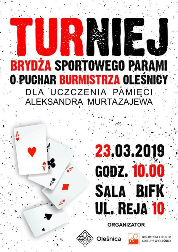 Zapraszamy na Turniej Brydża Sportowego parami o puchar Burmistrza Oleśnicy dla uczczenia pamięci Aleksandra Murtazajewa.