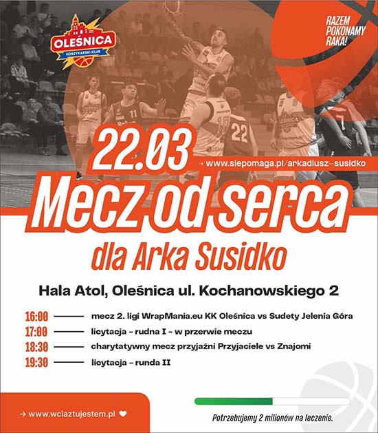 WrapMania.eu Oleśnica włączyła się również w pomoc, jakiej potrzebuje jeden z mieszkańców Oleśnicy, który walczy z nowotworem trzustki. Tuż po ligowej potyczce odbędzie się Mecz od Serca dla Arka Susidko, w którym zmierzą się Przyjaciele i Znajomi oleśniczanina. Obie drużyny zostaną poprowadzone przez swoich trenerów Wojtka Salika i Wojtka Bartnika. Spotkanie rozpocznie się około godz. 18.30, a wcześniej będą prowadzone licytacje i kiermasz ciast.