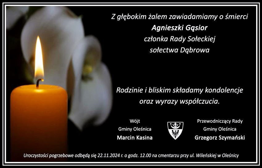 – Z głębokim żalem przyjęliśmy wiadomość o śmierci Agnieszki Gąsior, mieszkanki gminy Oleśnica. W tym trudnym czasie składamy szczere kondolencje całej rodzinie oraz bliskim – napisał wójt Marcin Kasina.