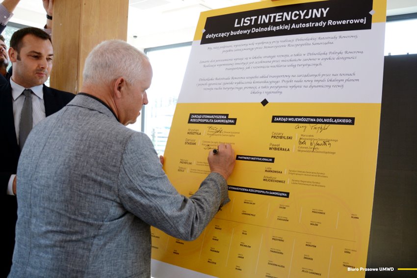 Dziś w Rudzie Sułowskiej samorządowcy i przedstawiciele instytucji zaangażowanych w projekt podpisali list intencyjny. Samorząd województwa reprezentowali marszałek Cezary Przybylski oraz Paweł Wybierała, członek zarządu województwa. – Dzięki porozumieniu między województwem, samorządami i instytucjami państwowymi zrealizujemy inwestycję, która ustanowi nowe standardy budowy tras rowerowych. Wytyczne określone przez Instytut Rozwoju Terytorialnego pozwolą wybudować ścieżki bezpieczne, dobrze oznakowane i solidnie wykonane. Dzięki rozmowom i zawartemu porozumieniu elementy tras budowane przez poszczególne samorządy będą łączyć się w całość – wyjaśnia marszałek Cezary Przybylski z Bezpartyjnych Samorządowców.