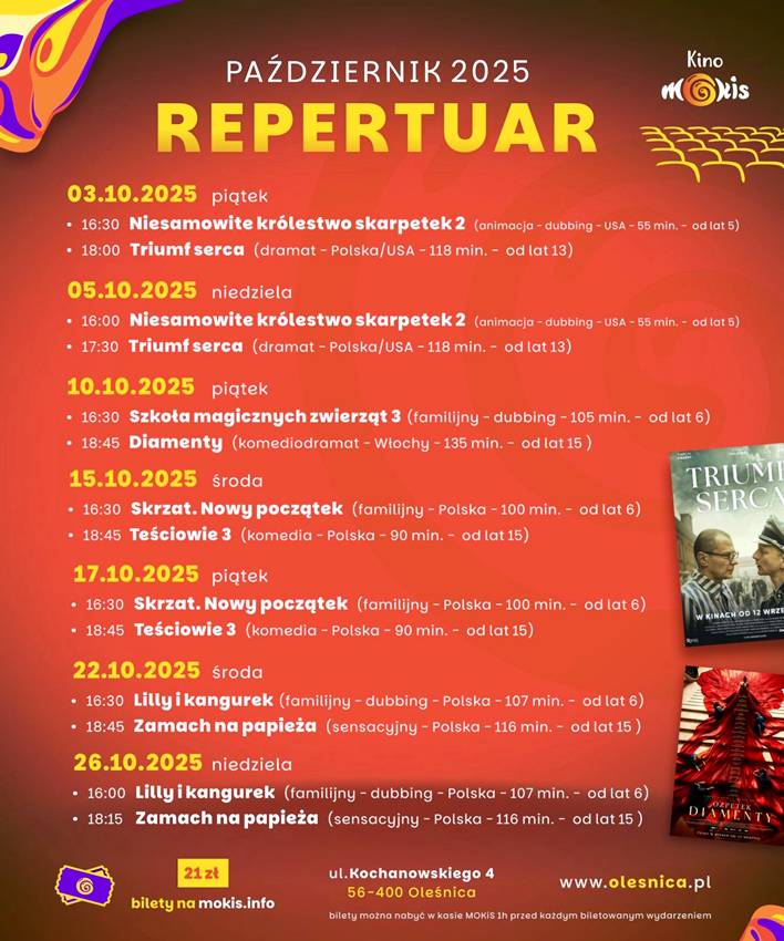 Miejski Ośrodek Kultury i Sztuki w Oleśnicy zaprasza do zapoznania się z nowym repertuarem Kina MOKiS. Bilety w cenie 20 zł można kupić w systemie on-line Bilety24.pl. Do biletów sprzedawanych w systemie Bilety24.pl doliczana jest prowizja dla operatora (1 zł). Bilety w kasie MOKiS w cenie 21 zł.
