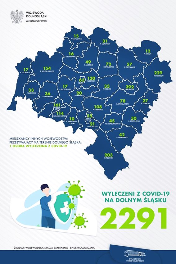 Wojewoda Dolnośląski Jarosław Obremski podał aktualną liczbę osób wyleczonych z COVID-19 dla województwa dolnośląskiego oraz powiatów.