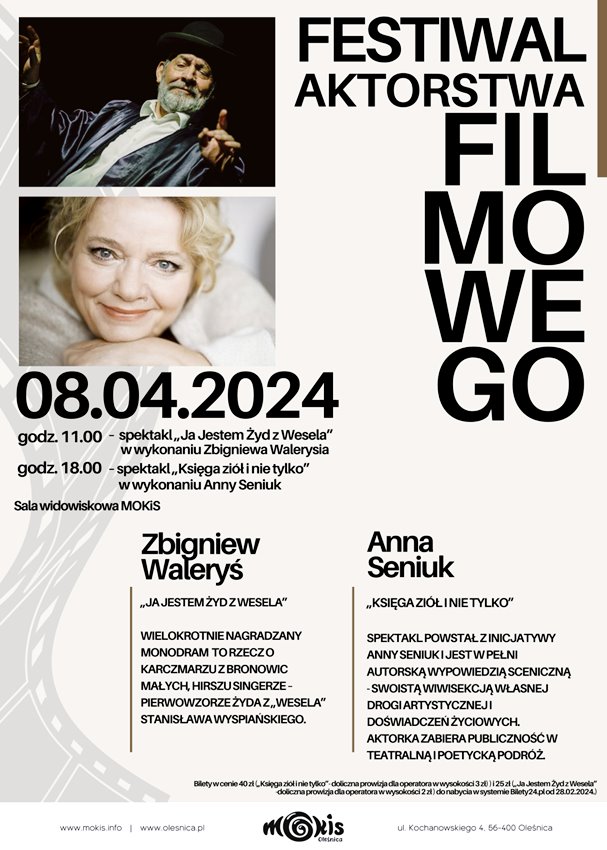Miejski Ośrodek Kultury i Sztuki w Oleśnicy zaprasza do udziału w Festiwalu Aktorstwa Filmowego, podczas którego będzie można zobaczyć spektakle: ,,Księga ziół i nie tylko” w wykonaniu Anny Seniuk oraz „Ja Jestem Żyd z Wesela” w wykonaniu Zbigniewa Walerysia.