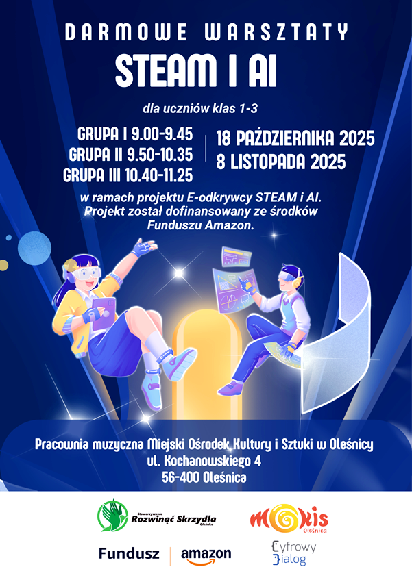 Razem ze Stowarzyszeniem "Rozwinąć Skrzydła" działającym przy Szkole Podstawowej nr 3 w Oleśnicy MOKiS zaprasza do udziału w bezpłatnych warsztatach dla dzieci z klas 1-3 w ramach projektu E-odkrywcy STEAM i AI.