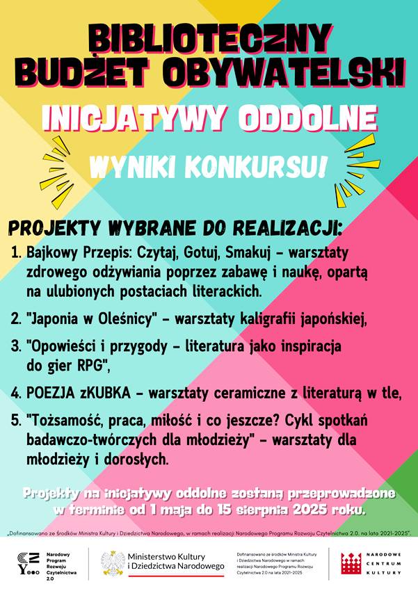 Oleśnicka Biblioteka Publiczna im. Mikołaja Reja ogłasza wyniki konkursu na oddolne inicjatywy lokalne "Biblioteczny Budżet Obywatelski" realizowanego w ramach projektu BLISKO dofinansowanego ze środków Ministra Kultury i Dziedzictwa Narodowego, w ramach realizacji Narodowego Programu Rozwoju Czytelnictwa 2.0. na lata 2021-2025." (2024-2025) pn. "Przygodę z Biblioteką w Oleśnicy czas zacząć".