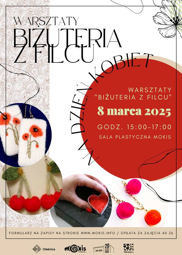 Miejski Ośrodek Kultury i Sztuki w Oleśnicy zaprasza do udziału w warsztatach „Biżuteria z filcu na Dzień Kobiet”, które odbędą się 8 marca w godzinach 15:00–17:00 w sali plastycznej MOKiS.
