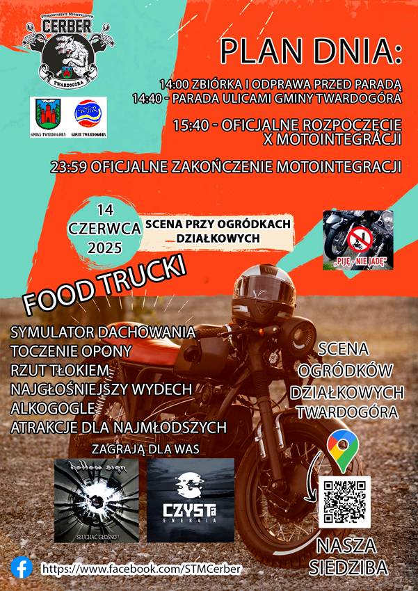 – Hej motocykliści! Szykuje się wyjątkowa impreza i nie może was na niej zabraknąć. Zabierajcie swoje maszyny, dobre nastroje i wpadajcie. Gaz do dechy i do zobaczenia! – z entuzjazmem zaprasza na Robert Piskorz, prezes Stowarzyszenia Motocyklistów „Cerber”.