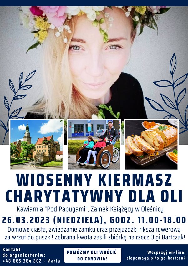 Rodzina oraz przyjaciele Oli Bartczak zapraszają wraz z Zamkiem Książęcym w Oleśnicy i grupą rowerową Oleśnica Bajk Stajl na „Wiosenny Kiermasz Charytatywny dla Oli”!