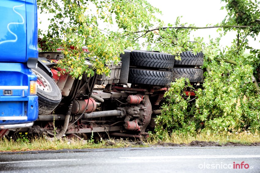 Do zdarzenia doszło przy ul. Dobroszyckiej. Ciężarówka wioząca drewno prawdopodobnie wpadła w poślizg i zjechała do przydrożnego rowu.