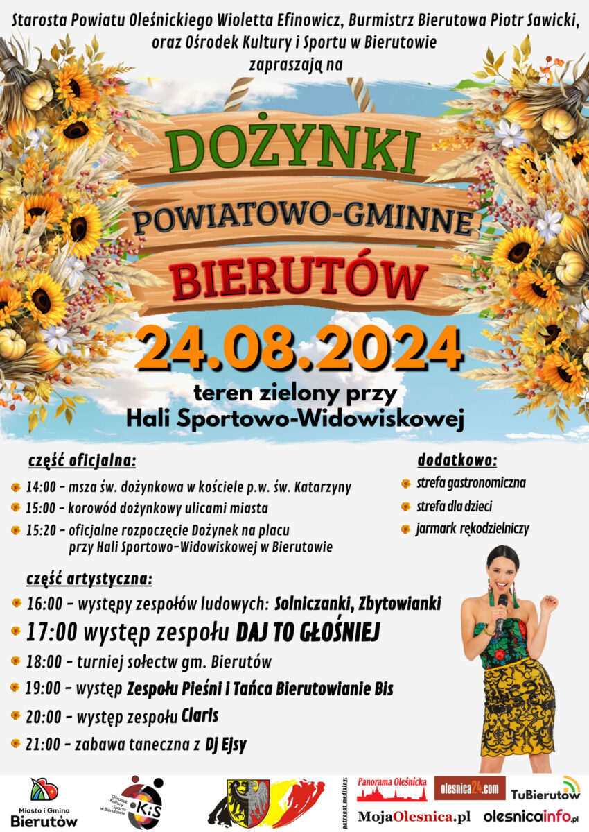 24 sierpnia na terenie przy sali sportowo-widowiskowej w Bierutowie odbędą się dożynki gminno-powiatowe. Zapraszają na nie burmistrz Bierutowa Piotr Sawicki oraz starosta Wioletta Efinowicz. Przed publicznością wystąpią m.in. Solniczanki i Zbytowianki oraz zespół Daj to głośniej.